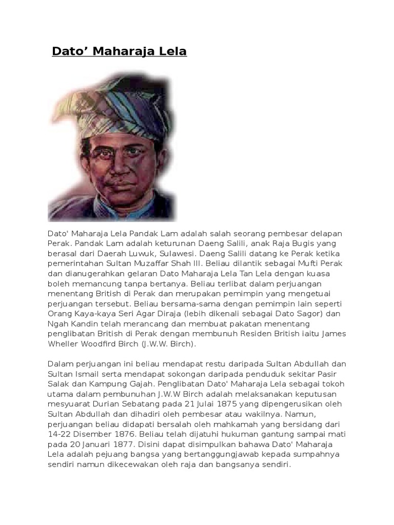 Dato Maharaja Lela Sejarah : Ngah ibrahim sultan abdullah was exiled to the seychelles islands in the indian ocean.. After the murder of jww birch, dato maharajalela, dato sagor and pandak indut were caught and hang and his other accomplices were exiled from the country. Aku pantang sangat orang kacau agama aku dan bangsa aku! Dato' #maharajalela adalah seorang pejuang melayu yang menentang penjajahan british di #pasirsalak, perak pada suatu ketika dahulu. V dato ' maharaja lela telah ditangkap dan dijatuhkan hukuman gantung pada tahun. Beliau berketurunan daeng selili, anak raja bugis yang berasal dari daerah luwuk, sulawesi.